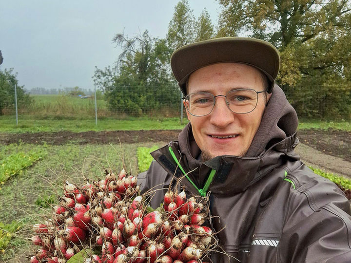 „Es ist harte Arbeit, aber wenn die Menschen ihre Gemüsekiste öffnen und glücklich sind, dann weiß ich, warum ich das tue“, sagt Julien Goldner, während er sich die Erde von den Händen wischt.